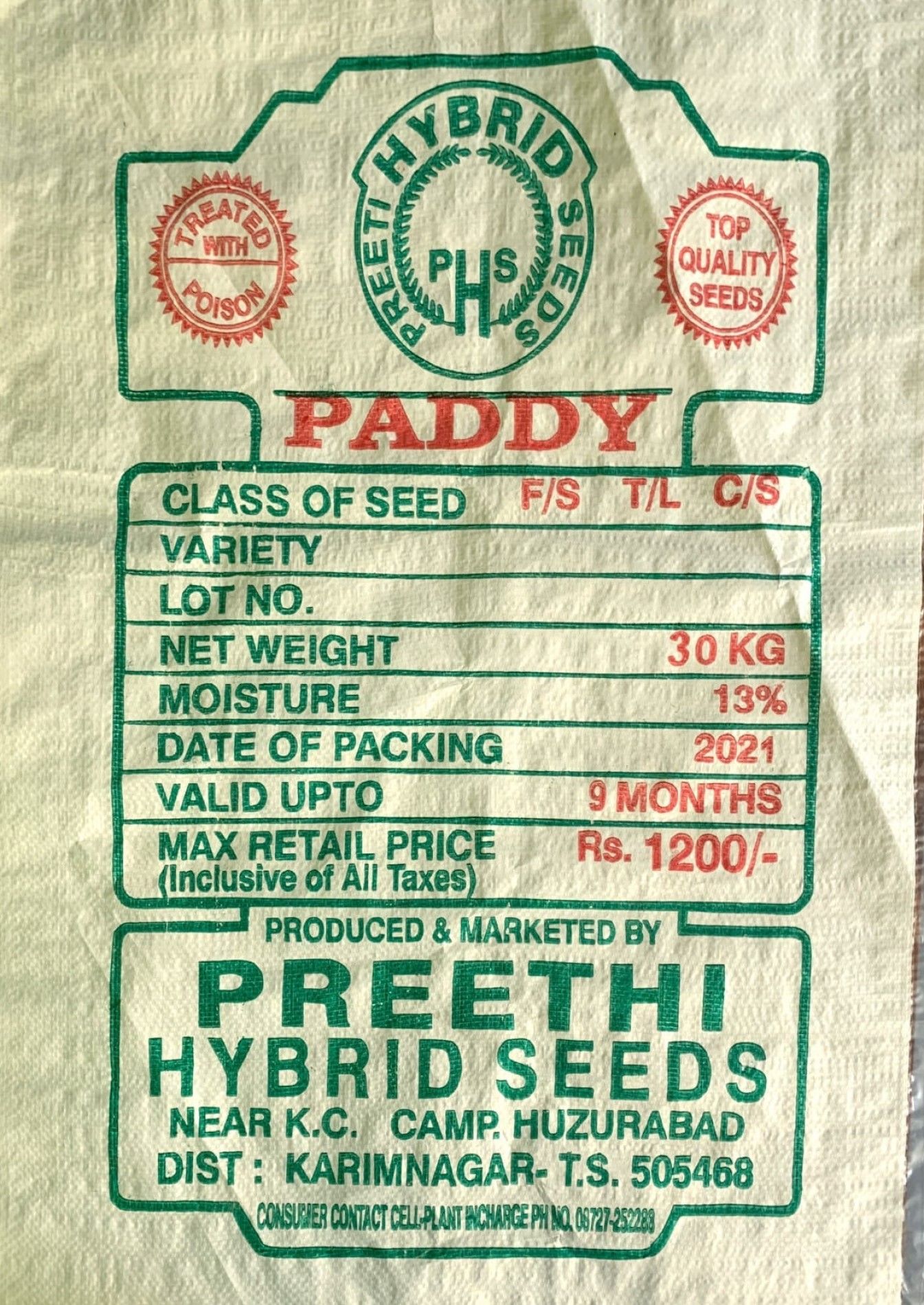 We supply with F/S T/L C/S seeds in this 30Kg plastic bags to out customers only on demand and can be used for any paddy variety.